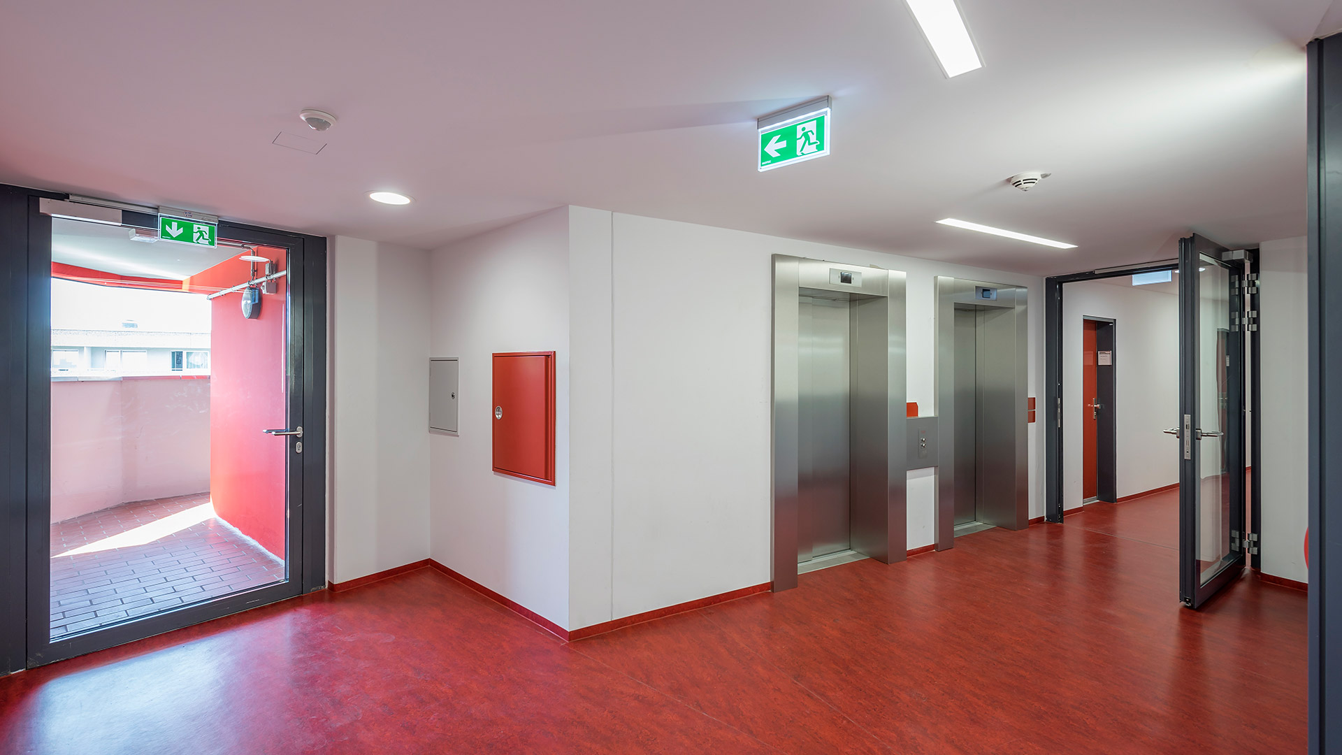 Im Zuge der Modernisierung und Sanierung wurde die gesamte Wohnanlage auch brandschutztechnisch ertüchtigt. Dafür wurden drei Treppenhäuser mit einer Druckentrauchungsanlage ausgestattet und zu Sicherheitstreppenhäusern aufgerüstet. Zusätzlich wurde die Hydrantenanlage um weitere Nasssteigleitungen erweitert, zwei zusätzliche Treppenhäuser in den Baukörper eingeschoben, ein Feuerwehraufzug errichtet und zusätzliche Fluchtwege erstellt, um den neuesten brandschutztechnischen Regeln zu entsprechen.